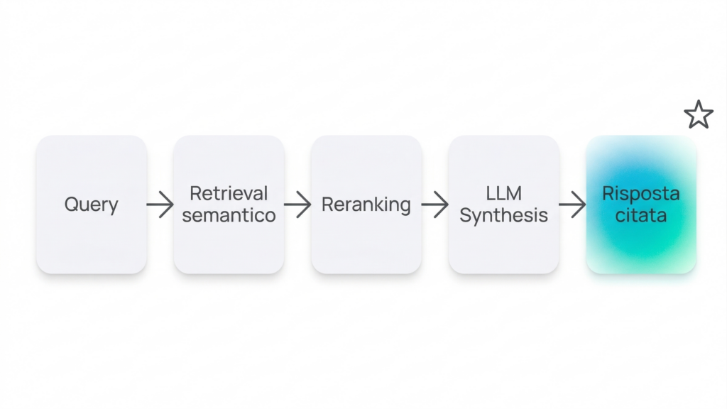 - Retrieval: il sistema cerca nei suoi indici i documenti più rilevanti per la query attraverso la ricerca semantica — non parole chiave esatte, ma vicinanza di significato nello spazio vettoriale.