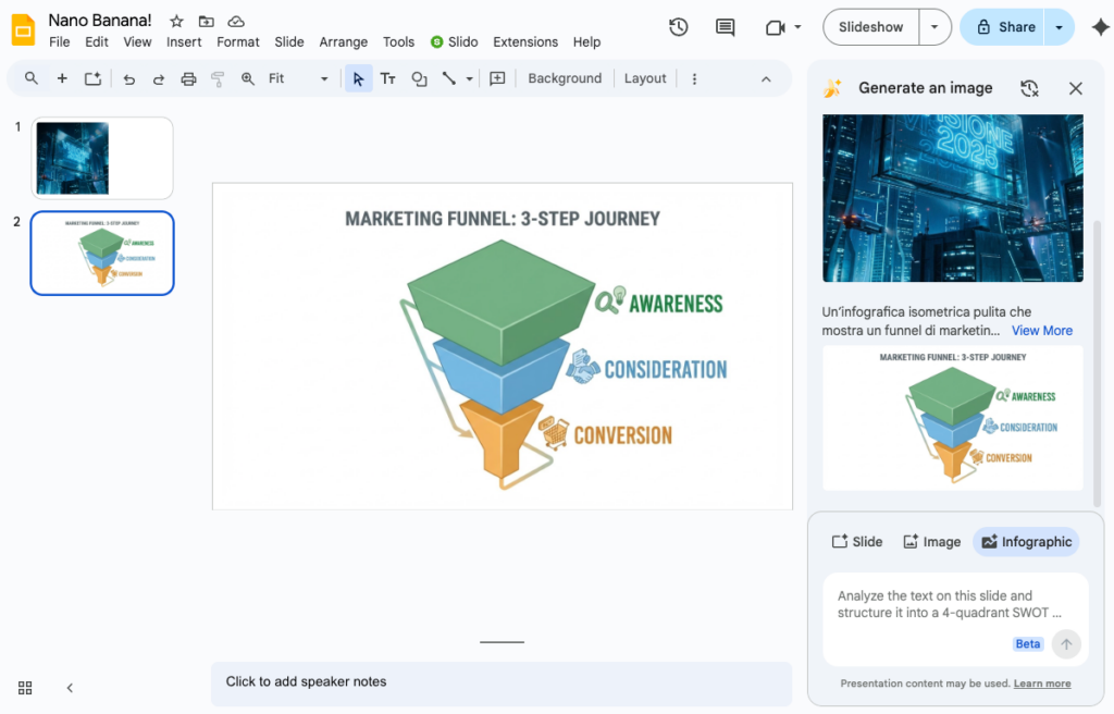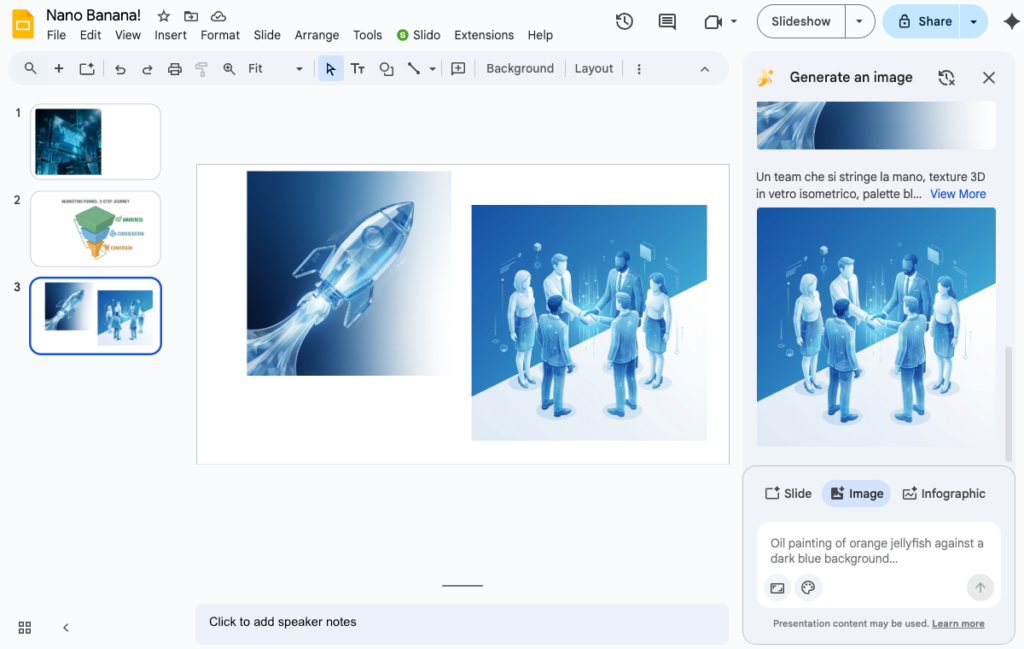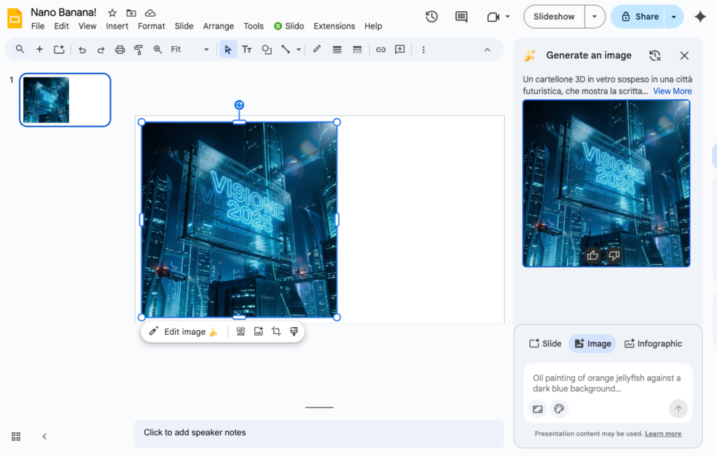 Di seguito vediamo quali funzioni offre questa integrazione (tramite la barra laterale di Slides, icona 🍌 “Clicca per scoprire di più”), le specifiche tecniche e limiti noti del modello e alcuni consigli pratici per ottenere risultati ottimali senza uscire da Slides.