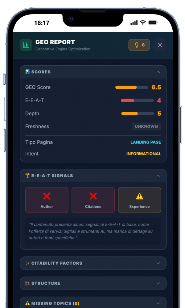 Il GEO Score è basato sui fattori che Google stesso dichiara importanti per le citazioni AI (E-E-A-T, struttura quotabile, chiarezza semantica) e sul confronto con i contenuti che vengono effettivamente citati nelle AI Overview.